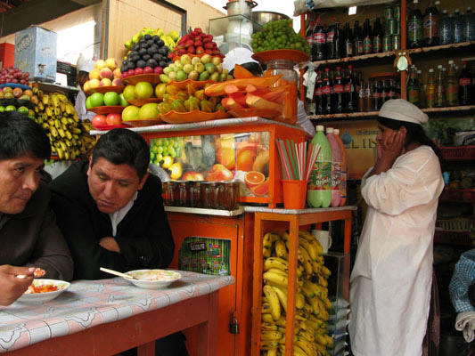 • Ze zdrowszych rzeczy - koktajl ze świeżych owoców na lokalnym targu warzywno-owocowym. Takie rynki są w każdej większej miejscowości, a na nich zawsze zarezerwowany jest kącik dla sprzedawczyń soków, sałatek owocowych i koktajli. Łatwo je namierzyć, bo okupują ustawione jeden przy drugim małe sklepiki ze stołeczkami od frontu i o ścianach częściowo zbudowanych ze spiętrzonych w zgrabne sterty owoców. Obowiązkowym atrybutem każdej sprzedawczyni soku jest kuchenny fartuszek oraz multiprocesadora, czyli przenośny mikser, umieszczony na honorowym miejscu wśród tych wszystkich niezliczonych frykasów, które można do niego wrzucić. Lista możliwych kombinacji soków liczy zwykle kilkadziesiąt pozycji, często w bardzo egzotycznych zestawieniach, do wyboru również w połączeniu z mlekiem i… piwem. Wszystko jedno, co wybierzesz – niebo w gębie gwarantowane! Tylko patrz sprzedawczyni na ręce, żeby nie dodała wody ani cukru. Moim ulubionym wyborem jest mleczny koktajl bananowo-melonowy oraz czysty sok z papai. Z tym ostatnim trzeba się zaprzyjaźnić i rozsmakować, bo z początku smakuje jak wymiociny, więc może z tym gwarantowanym niebem w gębie nieco przesadziłem:-).