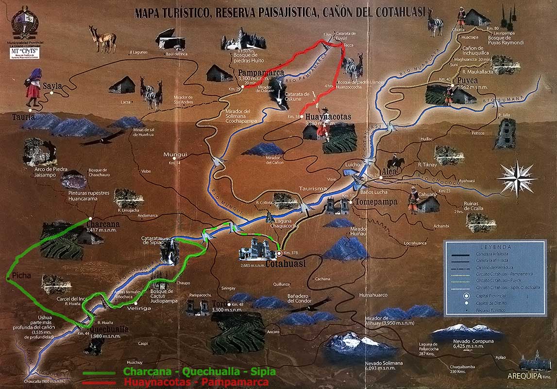 Po przeciwnej stronie Quechualla (w niższej części wsi) zaczyna się ścieżka biegnąca dnem doliny w górę kanionu Cotahuasi – od placu należy kierować się uliczką w dół, a potem na jej końcu odbić w prawo. Zaraz za wsią droga schodzi na dno kanionu. Dalej trasa oczywista, bo tylko jedna ścieżka biegnie wzdłuż rzeki w górę doliny Cotahuasi. Po drodze piękne "lasy" gigantycznych kaktusów Candelaria. Początkowo szlak wiedzie po prawej stronie rzeki, potem po lewej po antycznych tarasach używanych w czasach Inków. Potem znów mostem w wąskim miejscu przecina rzekę i dalej biegnie cały czas po prawej, aż do wodospadu Sipia. Zaraz za drugim mostem gorące źródło i basen zapraszają do kąpieli, chwilę potem wioska Velinga - kolejne darmowe winogrona:-). Wkrótce potem ścieżka się kończy i zaczyna piaszczysta, przejezdna droga, która wspina się wysoko na stoki kanionu po prawej stronie i dopiero za wodospadem Sipia schodzi znowu ku rzece.