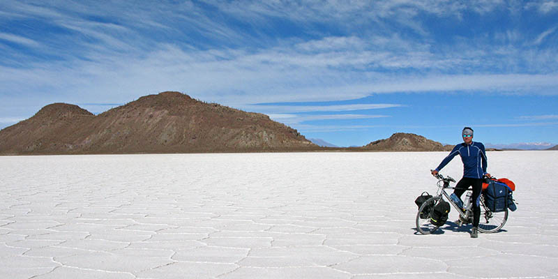 Salar de Uyuni jest moim ulubionym miejscem w Boliwii. To największe na świecie wyschnięte słone jezioro - 200 km od brzegu do brzegu, równa jak stół nawierzchnia i pełne kaktusów wyspy po środku. Wszystko to na wysokości 3656 m. Miejsce stworzone dla cyklistów. Bo co jest alternatywą? Wycieczka nabitą turystami Toyotą szlakiem innych Toyot, które stają w tych samych kilku miejscach i wszystkie razem (nierzadko kilkadziesiąt samochodów jednoczesnie!) zajeżdżają na jedną tylko wyspę. Na rowerze masz cały Salar dla siebie. Za darmo! Na jak długo zechcesz! Odwiedziłem go w ten sposób trzykrotnie: w 2001, 2007 i 2010 roku. Wrażenia z pierwszej wizyty znajdziesz w tekście: Najszersza autostrada w Boliwii